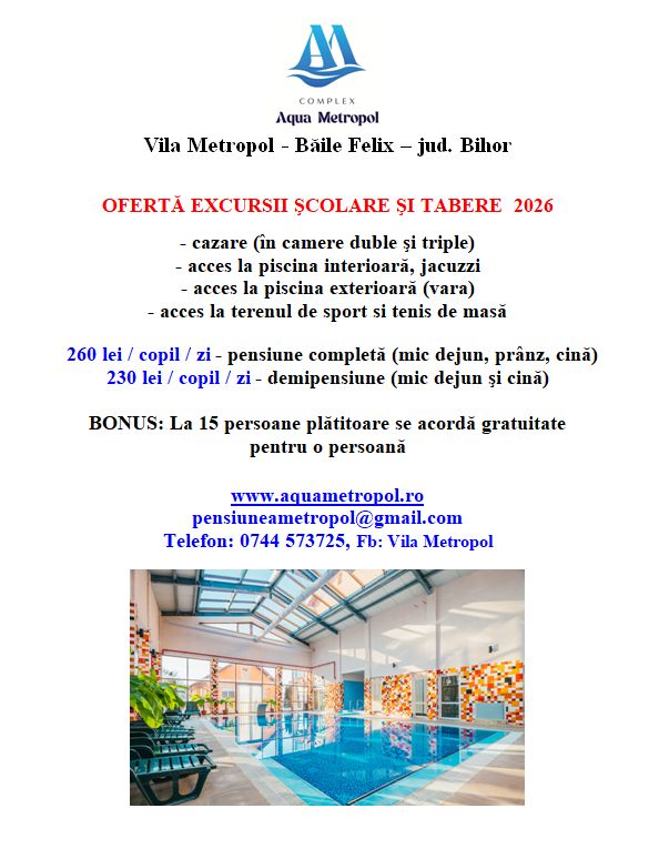 • acces piscină exterioară (01.05.2026 – 01.10.2026) cu şezlonguri incluse